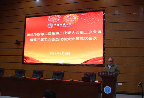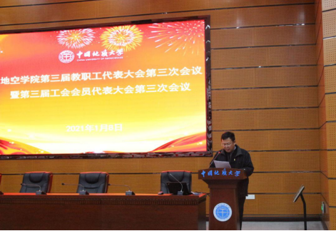 2021年1月8日下午16:30,地空学院在东区教学综合楼A0113召开第三届教职工代表大会第三次会议暨第三届工会会员代表大会第三次会议,党委常委、副校长刘勇胜、校工会副主席杨世清及学院全体教职工参加会议。会议由罗银河副院长主持。