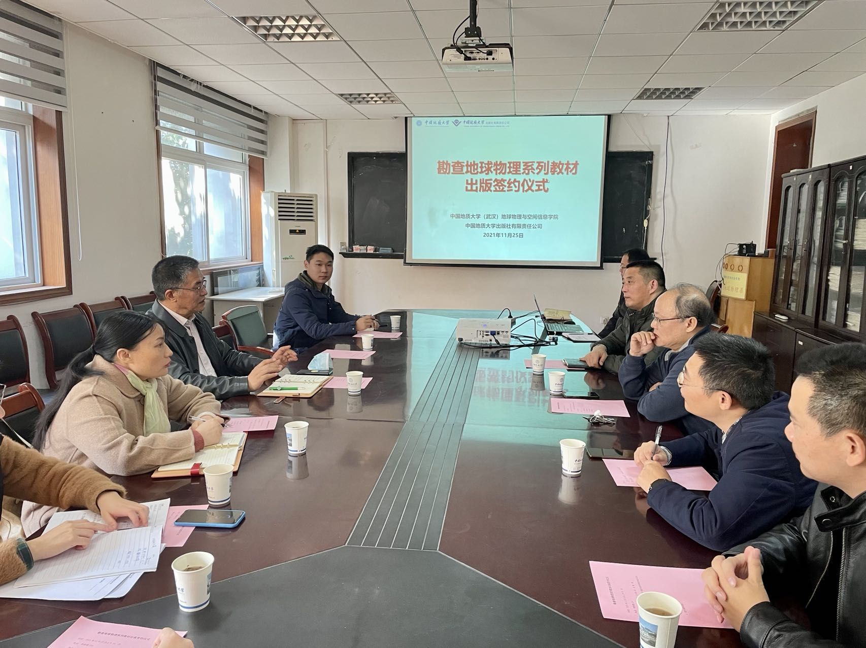 2021年11月25日,中国地质大学出版社与我院在物探楼214举办勘查地球物理系列教材签约仪式,会议由马彦周书记主持。罗银河副院长介绍勘查地球物理系列教材建设情况。中国地质大学出版社社长毕克成介绍了近年来教材和专著出版情况,并从系列化教材建设与研究成果出版给出建议。熊熊院长介绍了地空学院一流专业建设情况,并从教材、课程、人才培养等方面介绍了学院发展规划。