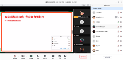 受新型冠状病毒的影响,根据《中国地质大学(武汉)关于调整2019-2020学年第二学期本科教学工作安排的通知》的精神要求, 064182团支部积极响应学校“停课不停学”的号召,组织各位同学在家中举行线上团会。在活动开始前,每一位支部成员均提前上线签到,体现了同学们对本次团会的重视程度。14时,全体在线上奏唱国歌,主持人李伟光宣布“众志成城同抗疫,青春聚力勇担当”主题线上团会正式开始。