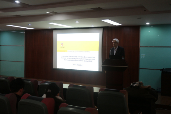 (通讯员陈涛、杨玮莹)2018年12月12日上午,国际著名摄影测量与遥感学家John Trinder教授应邀到访我校,并在地空学院222学术报告厅为全院师生做了题为“Assessing Sustainability of Urban Environments - Remote Sensing Analysis of Urban Expansion and The Sustainable Development Goals (SDG)”的学术报告。报告会由地空学院地球信息科学与技术系书记陈涛副教授主持,地空学院地球信息科学与技术系主任王毅教授,地球信息科学与技术系相关教师及研究生参加了学术交流会。